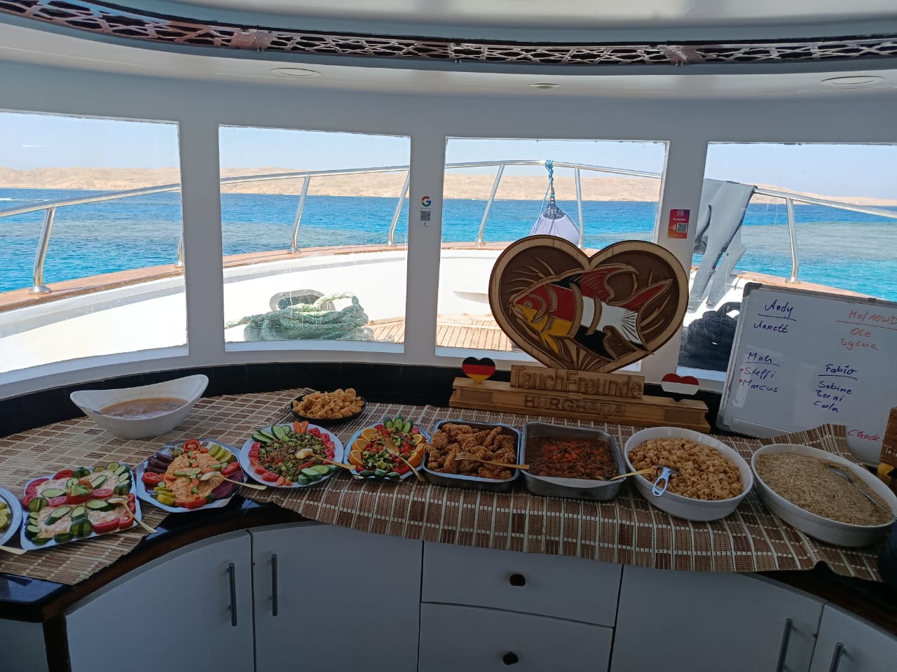 Die Neue Marina Hurghada mit ihrer beliebten Promenade, Restaurants und Cafés ist nur wenige Gehminuten entfernt. Auch das Arabia-Gebiet mit Hotels, Shops und Strandzugängen erreicht ihr in kurzer Zeit. Damit liegt unser Boot perfekt für alle, die kurze Wege, echtes Hurghada-Feeling und entspannte Tauchtage schätzen.
