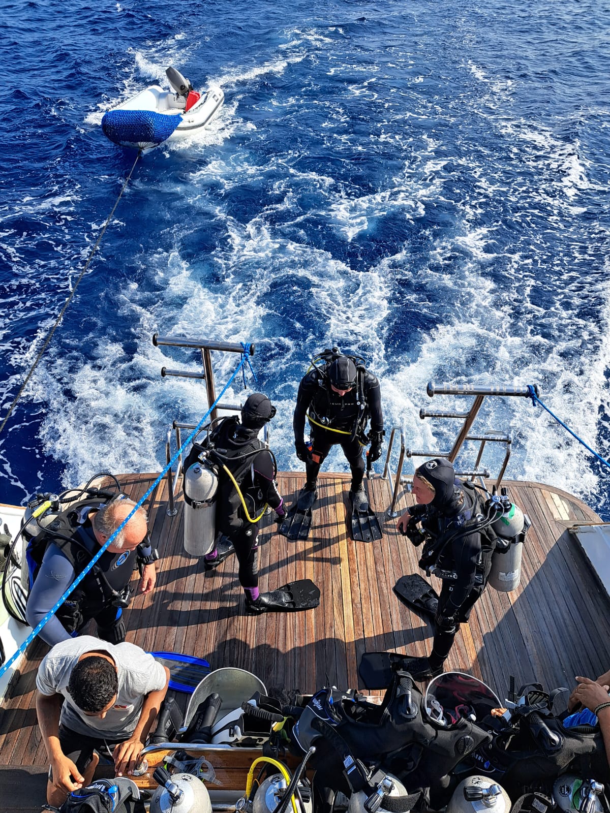 Wir führen außerdem ein Zodiac mit, das aktiv in die Tauchgangsplanung einbezogen wird. Es ermöglicht uns täglich, die Tauchgänge noch sicherer und komfortabler zu gestalten, flexible Spotwechsel vorzunehmen und im Notfall schnell zur Stelle zu sein. Für die optimale Kommunikation zwischen Boot und Zodiac werden Walkie-Talkies eingesetzt.